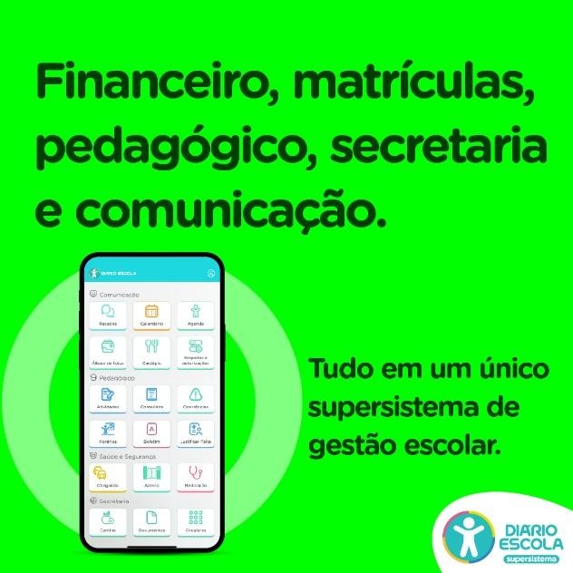 Por R$ 0,16 por aluno/dia, o supersistema Diário Escola integra e organiza todos os setores de gestão: financeiro, pedagógico, secretaria e comunicação. Assim, devolve à direção e à gestão escolar o que o excesso de planilhas e papéis havia tirado: a tranquilidade de educar com foco e propósito.